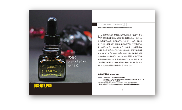 CL/IOSファクトリー様 AD/D/C/尾台広告事務所リールオイルはどれも同じ、そう思っていませんか。エキスパートのフィッシングスタイルも年々高まり使用されるリールにも高性能が要求されます。高性能リールのポテンシャルを引き出す高性能オイルを開発するIOSファクトリーです。